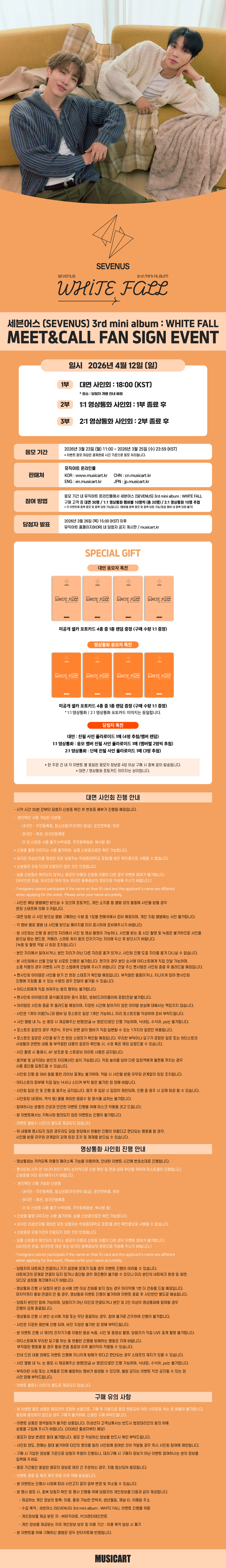 본 이벤트 상품은 응모권이 포함된 상품입니다.구매 완료 후 자동 응모되며, 응모권 사용 처리 되어 취소 및 환불이 불가하니 주의 바랍니다.** 미동의시 구매 불가합니다. ** 특전, 상품 누락 및 하자로 인한 교환 신청은 상품 수령 후 2주 안으로 문의 부탁드립니다.(누락 및 하자 확인용으로 개봉 시 동영상을 요청할 수 있습니다.) 한 주문 번호에 앨범 4장 구매 시 중복 없이 포토카드 4종이 증정됩니다. 여러 개의 주문 번호로 나눠서 구매할 경우 포토카드가 중복으로 증정될 수 있으니 이 점 유의해 주시기 바랍니다. ![]() ![]()